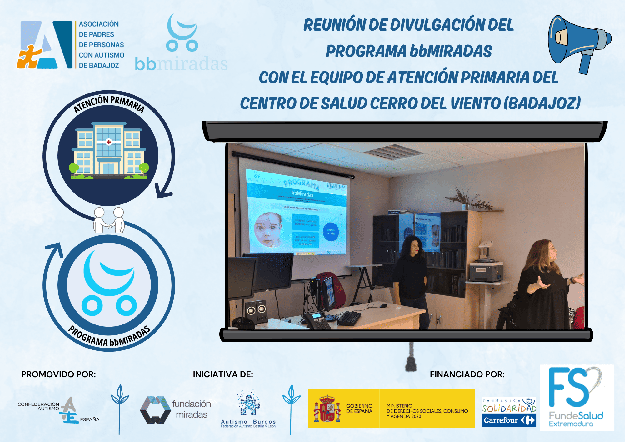 Hoy hemos vuelto a tener la oportunidad de dar a conocer el programa bbMiradas que se lleva a cabo en nuestra entidad. En esta ocasión, nos hemos reunido con diferentes profesionales del centro de salud «Cerro del Viento» de Badajoz.