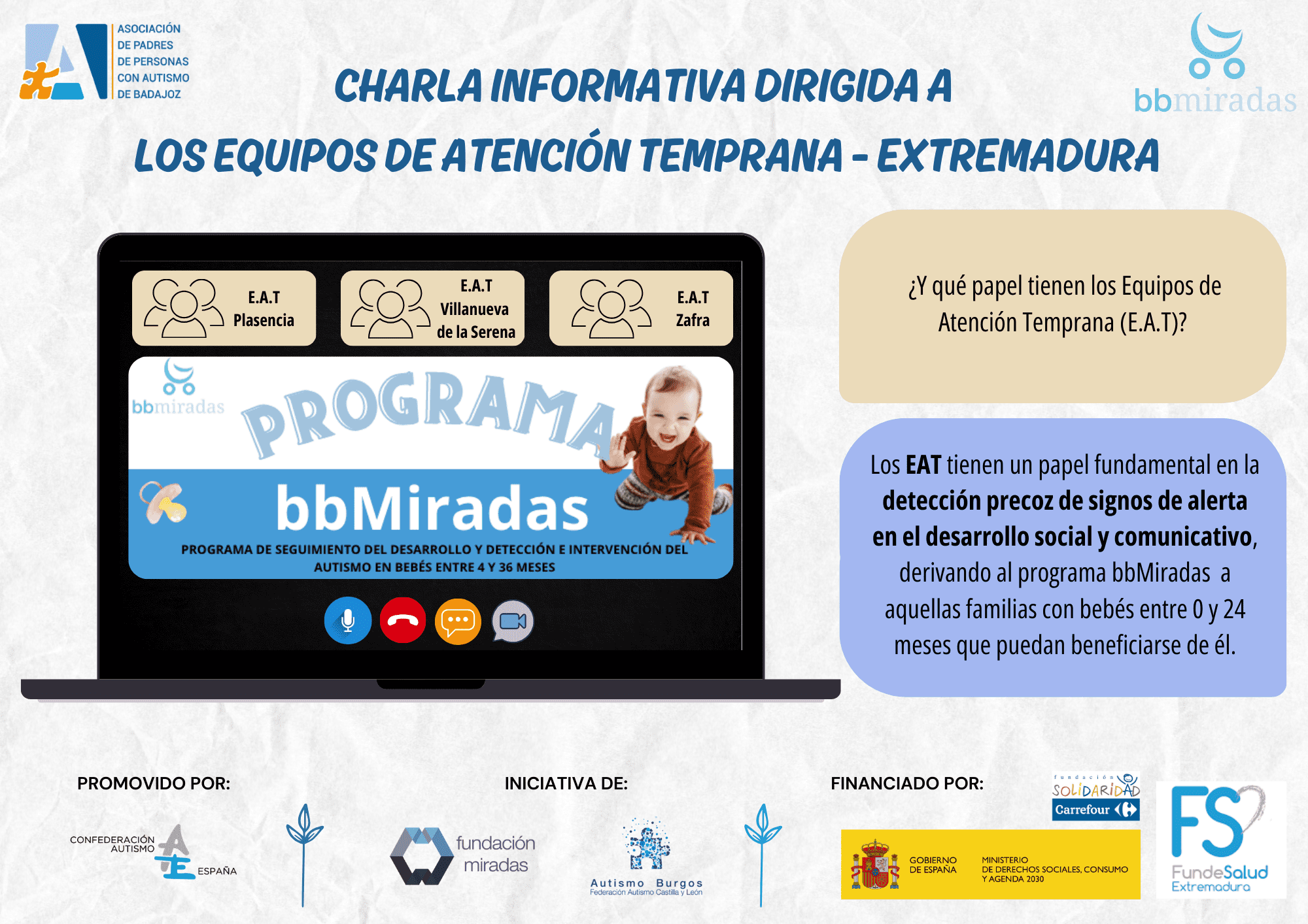 El pasado martes, 25 de Junio, tuvo lugar una charla informativa dirigida a los Equipos de Atención Temprana de Extremadura, así como a los Equipos Específicos de nuestra comunidad, para dar a conocer nuestro programa bbMiradas.