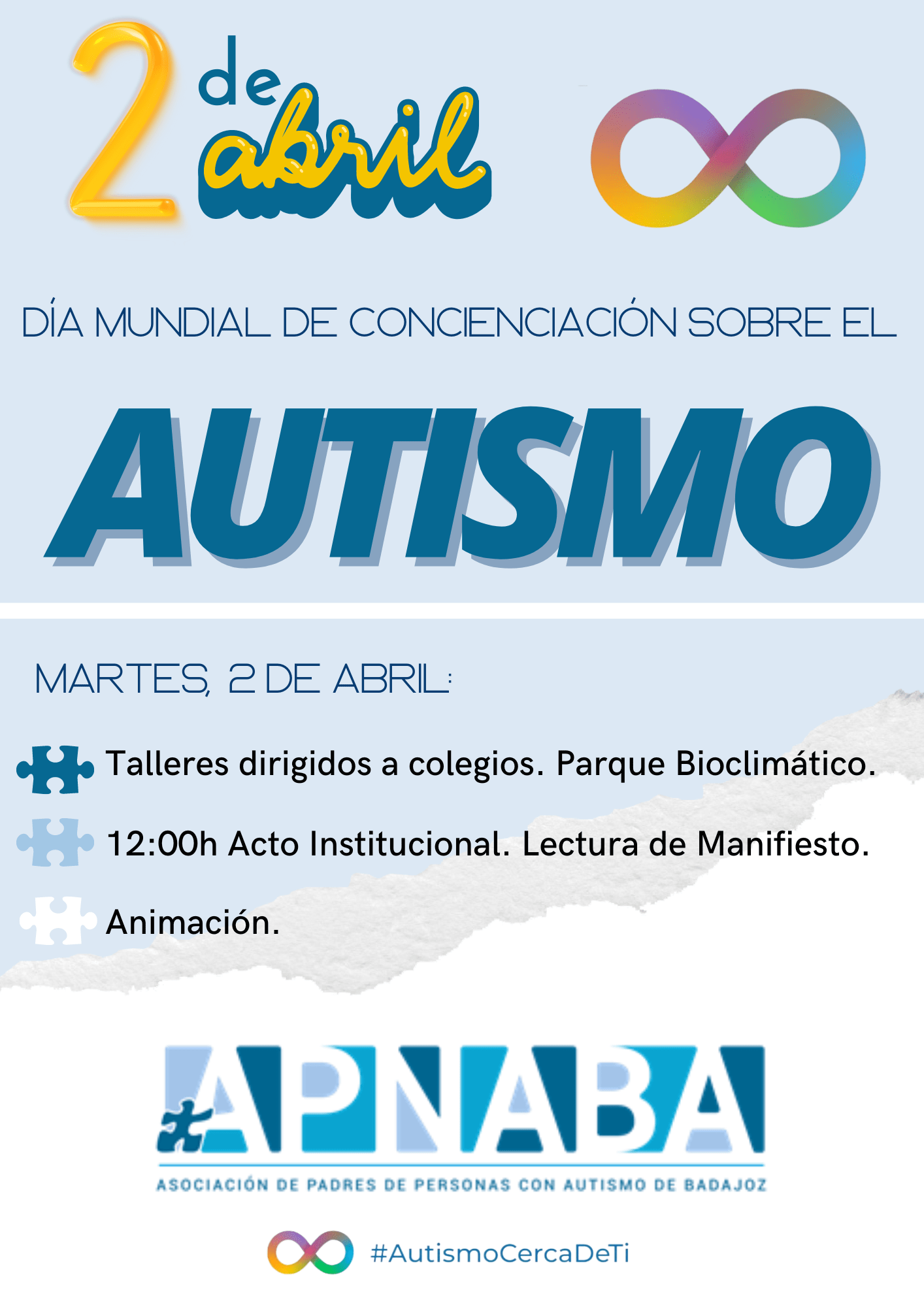 Un año más APNABA, con motivo del Día Mundial de Concienciación Sobre el Autismo, organiza, en el Parque Bioclimático de la ciudad de Badajoz, una jornada de Concienciación y Sensibilización, bajo el lema #autismocercadeti, a la que asistirán nueve colegios de la ciudad con un total de trescientos alumnos/as, para realizar talleres destinados a concienciar sobre el Trastorno del Espectro del Autismo.