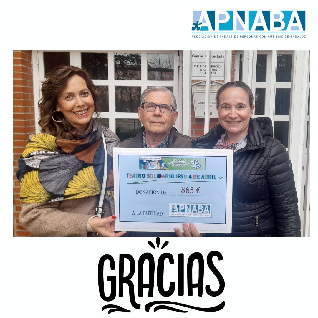 Desde APNABA queremos agradecer al IESO 4 de Abril de la localidad de Zahínos la donación de la recaudación obtenida con motivo de la celebración del Teatro Solidario el pasado viernes día 13 de diciembre.