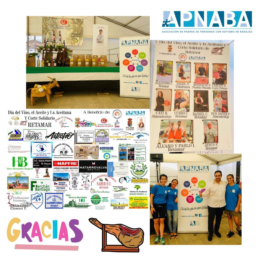 Desde la Junta directiva de APNABA, los trabajadores, las personas con autismo y sus familias queremos dar las gracias al Ayuntamiento de Solana, a la Comisión de festejos, a la Cooperativa Corazón de Jesús, a Viñaoliva, a los 40 autónomos y empresarios que han colaborado, a todo el pueblo de Aldea de Retamar y a Curro Cáceres por organizar y conseguir que 11 cortadores de jamón y queso hayan estado este día de manera totalmente solidaria.