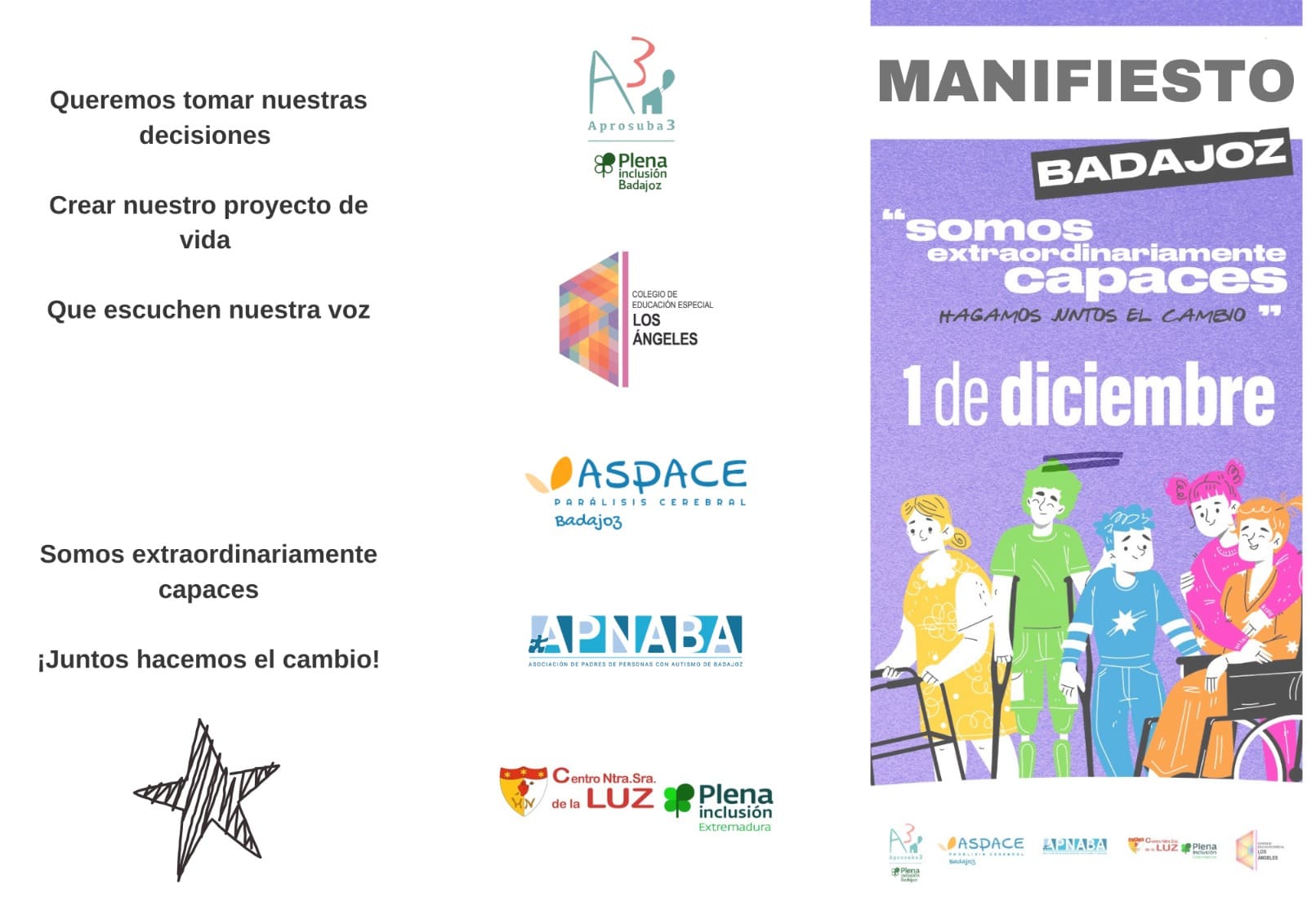 La comisión formada por representantes de diferentes entidades (Aprosuba 3, Plena inclusión Badajoz, ASPACE, APNABA, C nuestra señora de la luz, y CEE Los Ángeles) hemos  organizado este evento para dar voz a las personas con discapacidad y sus famlias, y hacer ver que un cambio es posible.