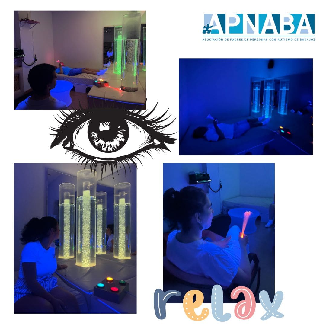 Esta semana los usuarios de Rae han tenido una sesión en la Sala Multisensorial. Han podido disfrutar de la cama de agua, los tubos de burbujas y de la música.